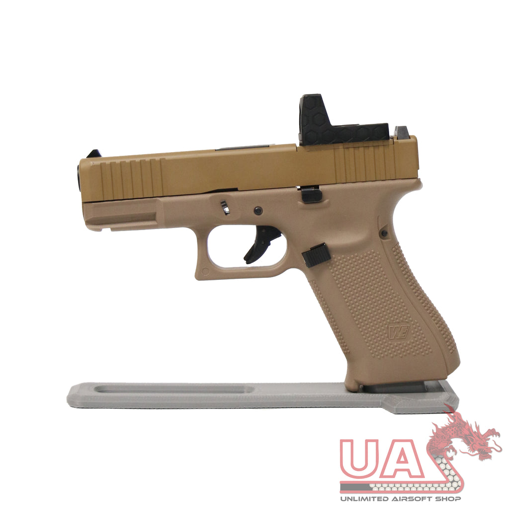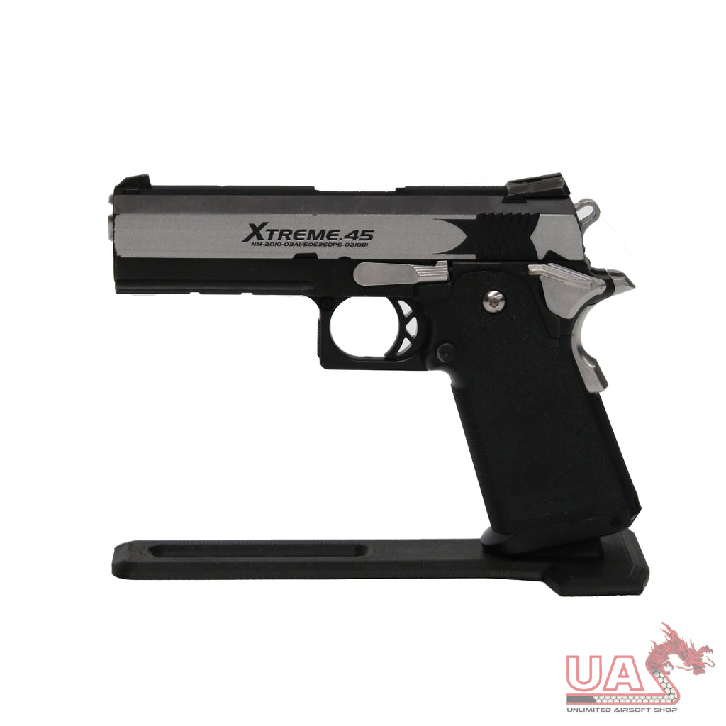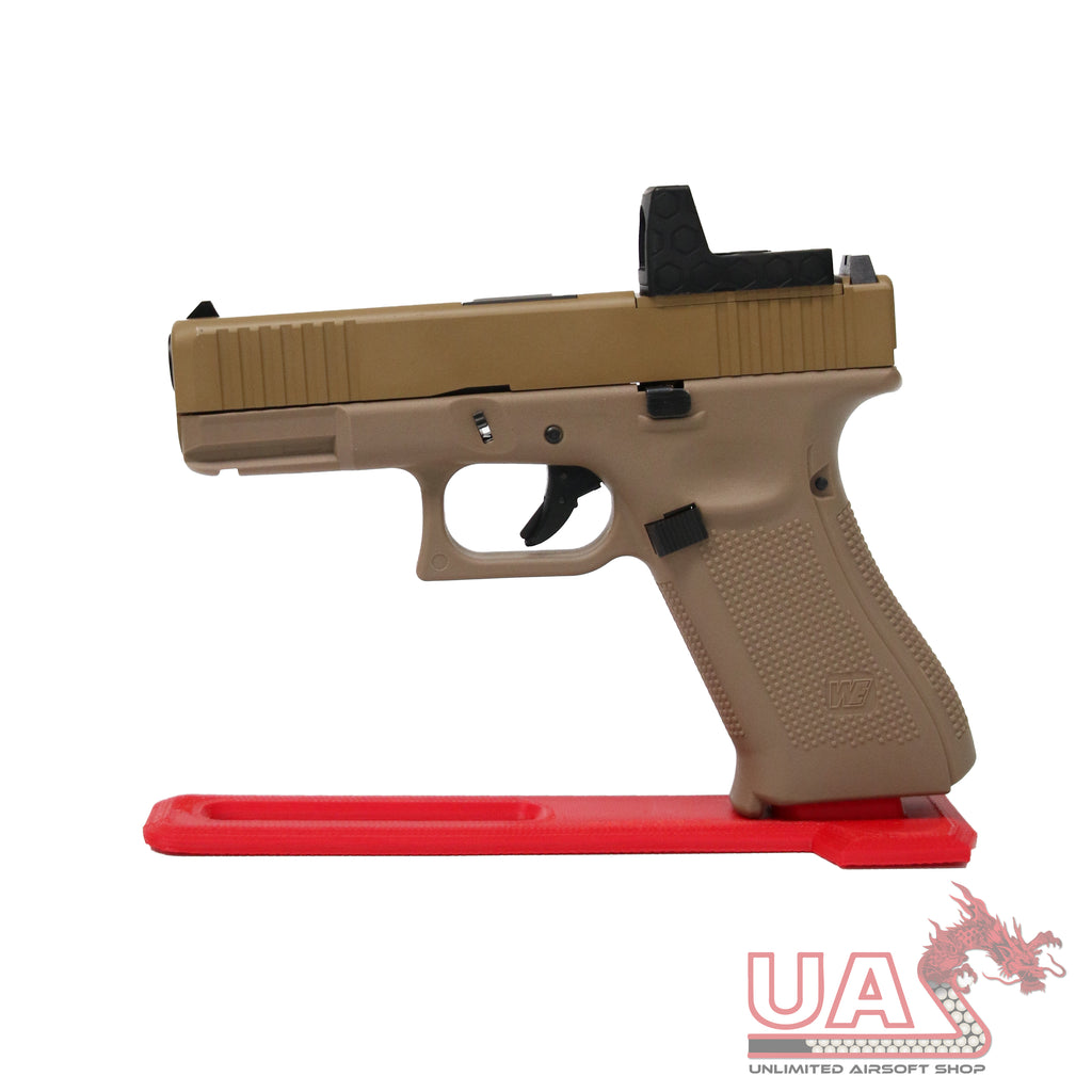 Showcase your favourite replica with our made in house 3D Printed Pistol Stands!Designed for Hi-Capa pattern pistols, and Glock pattern pistols.