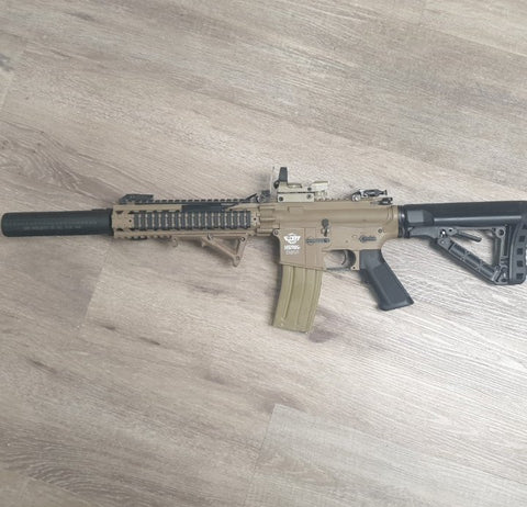This bad boy has been cosmetically treaked out with a surefire styled torch with presure switch ,tan reddot , AFG and SRC Honey comb Silencer.