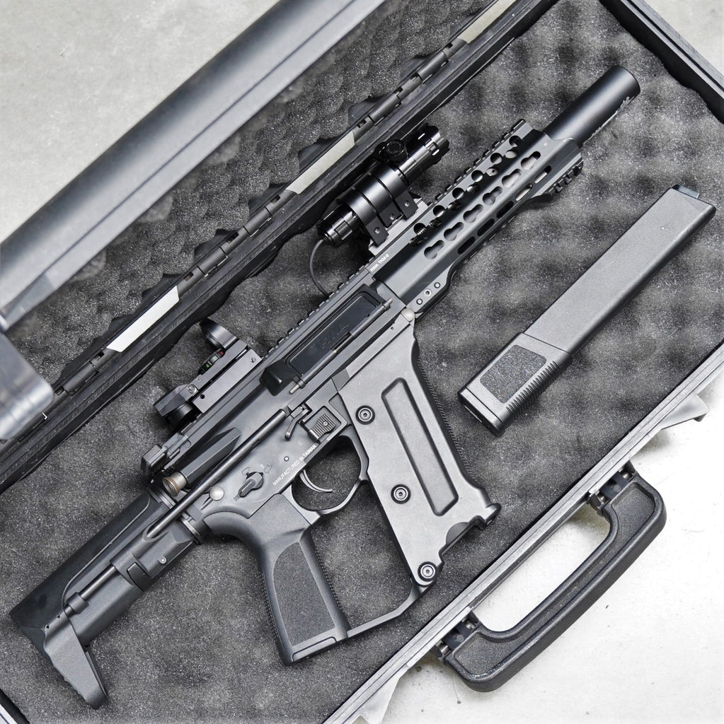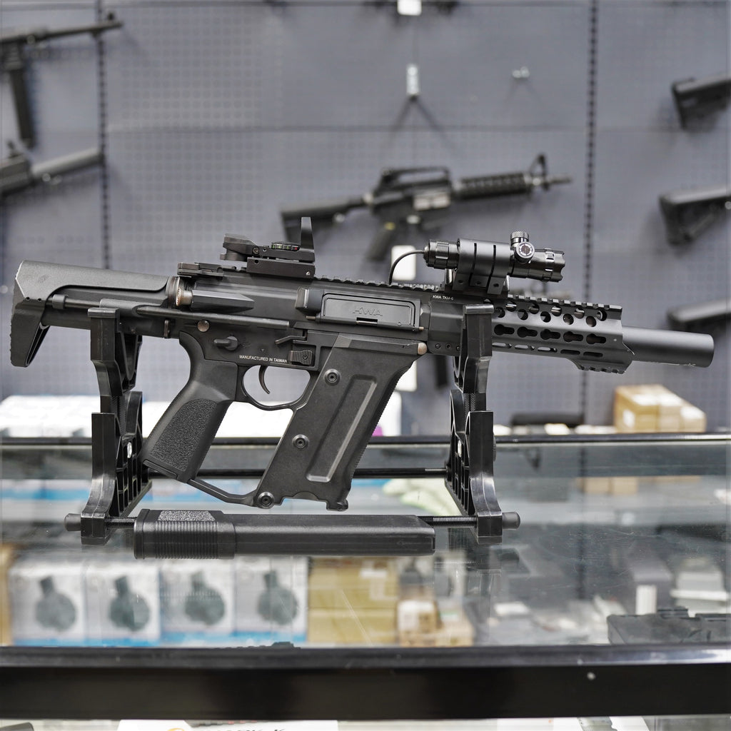 Comes with smg length gun case, reflex red dot sight, laser with pressure pad, G&G mock suppresor and 120rd mid-cap.